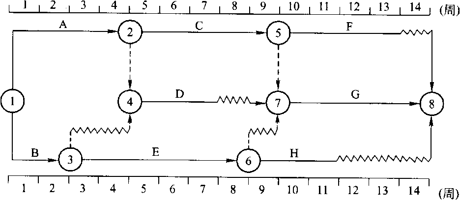 解析:網絡計劃的起點節點的最早開始時間為零。工作最早完成時間等于該工作最早開始時間加上持續時間,相鄰兩項工作i和j之間的時間間隔LAGi-j等于緊后工作j的最早開始時間ESj和本工作的最早完成時間EF之差,即:LAGi-j=ESj-EFi。其他工作i的總時差TFi等于該工作的各個緊后工作j的總時差TFj加該工作與其緊后工作之間的時間間隔LAGi-j之和的最小值,即:TFi=min{TE+LAGi-j}。當工作i有緊后工作j時,其自由時差FFj等于該工作與其緊后工作j之間的時間間隔LAGi--j的最小值,即:FFi=min{LAGi-j}。因此本題正確選項為ADE。