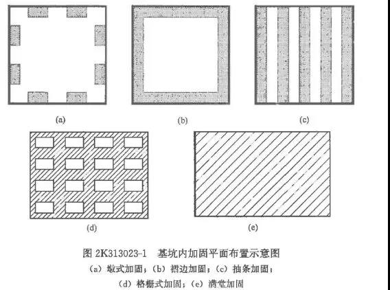 (2) 采用水泥土攪拌、高壓噴射注漿、注漿或其他方法對地基摻人一定量的同化劑或使土體固結,以提高土體的強度和土體的側(cè)向抗力為主,適用于深基坑。基坑內(nèi)被動區(qū)加固形式主要有墩式加固、裙邊加固、抽條加固、格柵式加固和滿堂加固。