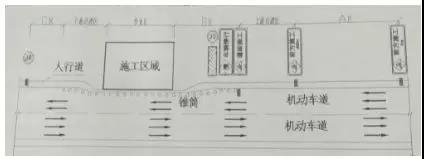 基坑臨近城市次干路,圍擋施工占用部分現(xiàn)況道路,項目部編制了交通導行圖(圖1)。在路邊按要求設置了A區(qū)、上游過渡區(qū)、B區(qū)、作業(yè)區(qū)、下游過渡區(qū)、C區(qū)*個區(qū)段,配備了交通導行標志、防護設施、夜間警示信號。