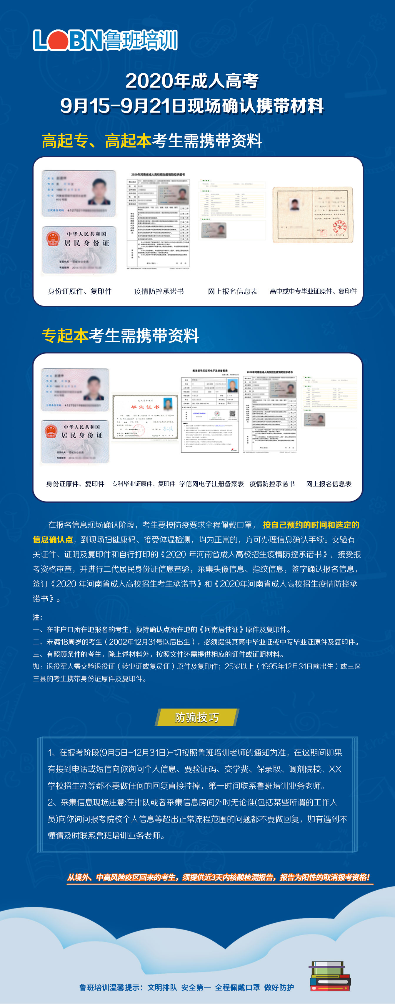 在報(bào)名信息現(xiàn)場(chǎng)確認(rèn)階段,考生要按防疫要求全程佩戴口罩,按自己預(yù)約的時(shí)間和選定的信息確認(rèn)點(diǎn),到現(xiàn)場(chǎng)掃健康碼、接受體溫檢測(cè),均為正常的,方可辦理信息確認(rèn)手續(xù)。交驗(yàn)有關(guān)證件、證明及復(fù)印件和自行打印的《2020年河南省成人高校招生疫情防控承諾書》,接受報(bào)考資格審查,并進(jìn)行二代居民身份證信息查驗(yàn),采集頭像信息、指紋信息,簽字確認(rèn)報(bào)名信息,簽訂《2020年河南省成人高校招生考生承諾書》和《2020年河南省成人高校招生疫情防控承諾書》。凡經(jīng)過網(wǎng)上報(bào)名而未進(jìn)行報(bào)名信息確認(rèn)的考生,網(wǎng)上報(bào)名無效。體溫檢測(cè)為異常的,在當(dāng)?shù)匦l(wèi)生防疫部門的指導(dǎo)評(píng)估后,按我省疫情防控要求處理。從境外和中高風(fēng)險(xiǎn)疫區(qū)回來的考生、無癥狀感染者經(jīng)治愈的考生,必須提供近3天的核酸檢測(cè)報(bào)告,核酸檢測(cè)報(bào)告為陽性的,取消其報(bào)考資格。