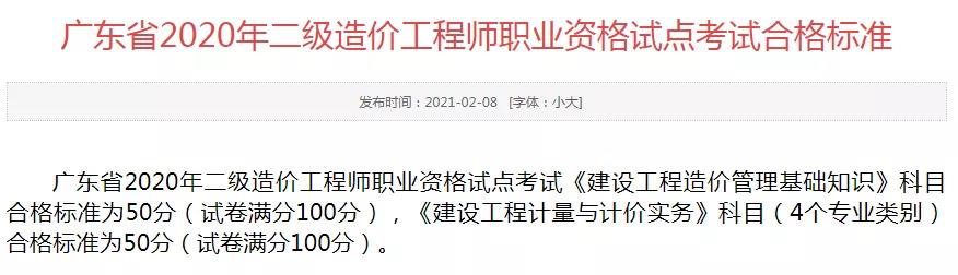 廣東省2020年二級造價工程師職業資格試點考試《建設工程造價管理基礎知識》科目合格標準為50分(試卷滿分100分),《建設工程計量與計價實務》科目(4個專業類別)合格標準為50分(試卷滿分100分)。