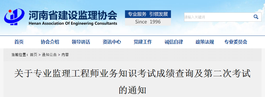 11月18日舉行的專業監理工程師業務知識考試,成績今日公布。請參加考試的學員登陸協會網站,在“河南省建設監理從業人員教育培訓系統”里查詢成績,合格標準是105分。