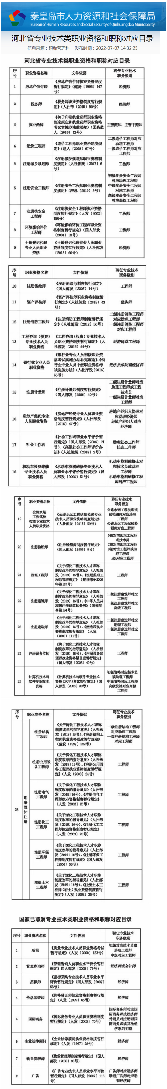 秦皇島人社局公布《河北省專業(yè)技術(shù)類職業(yè)資格和職稱對(duì)應(yīng)目錄》,序號(hào)第23號(hào)明確一級(jí)建造師對(duì)應(yīng)工程師。