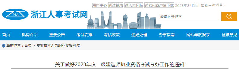 根據住房和城鄉建設部執業資格注冊中心《關于提供 2023年度二級建造師執業資格考試有關服務的說明》以及省人力社保廳《關于印發 2023 年度專業技術人員職業資格考試工作計劃的通知》(浙人社辦發〔2023〕號)和省人力社保廳、省建設廳《關于規范完善二級建造師執業資格有關制度的通知》(浙人社發〔2016〕8 號)文件精神,現將我省 2023 年度二級建造師執業資格考試考務工作有關事項通知如下。