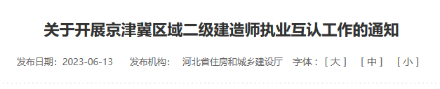 近期河北省住房和城鄉建設廳發布通知:自6月13日起,注冊在北京市、天津市、河北省建筑業企業中的二級建造師,可隨注冊企業在京津冀區域內承攬工程項目!