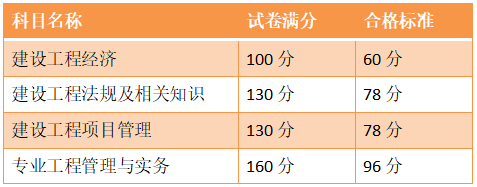 一級建造師考試共計有4個科目,各個科目的滿分均不相同,考試及格分數為滿分的60%,因此各個科目的及格分數也是不相同的。