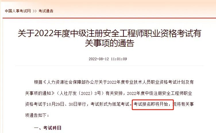 關于2022年度中級注冊安全工程師職業資格考試有關事項的通告