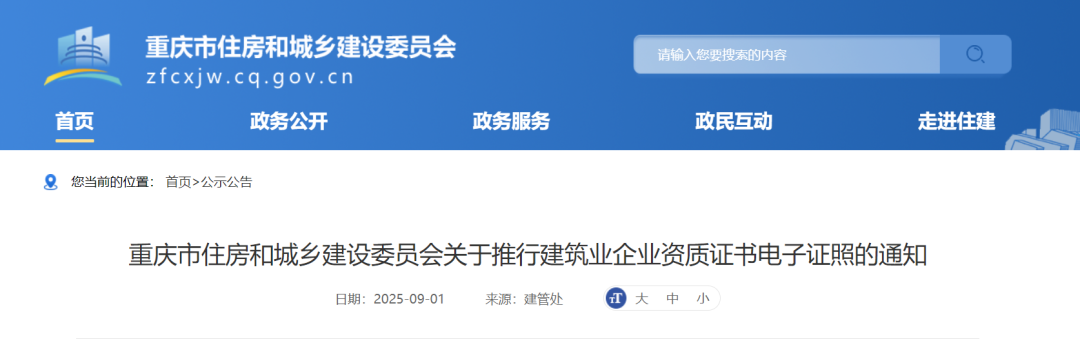 重慶市住建委發布《關于推行建筑業企業資質證書電子證照的通知》,明確:自2025年9月1日起,對全市范圍內申請建筑業企業資質行政許可及施工勞務資質備案事項并獲審批通過的企業,統一核發電子證照,不再制發紙質資質證書。