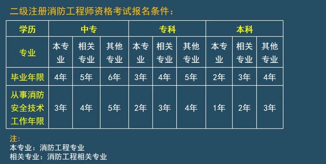 (二)取得消防工程專業(yè)大學專科學歷,從事消防安全技術(shù)工作滿2年;或者取得消防工程相關專業(yè)大學??茖W歷,從事消防安全技術(shù)工作滿3年。