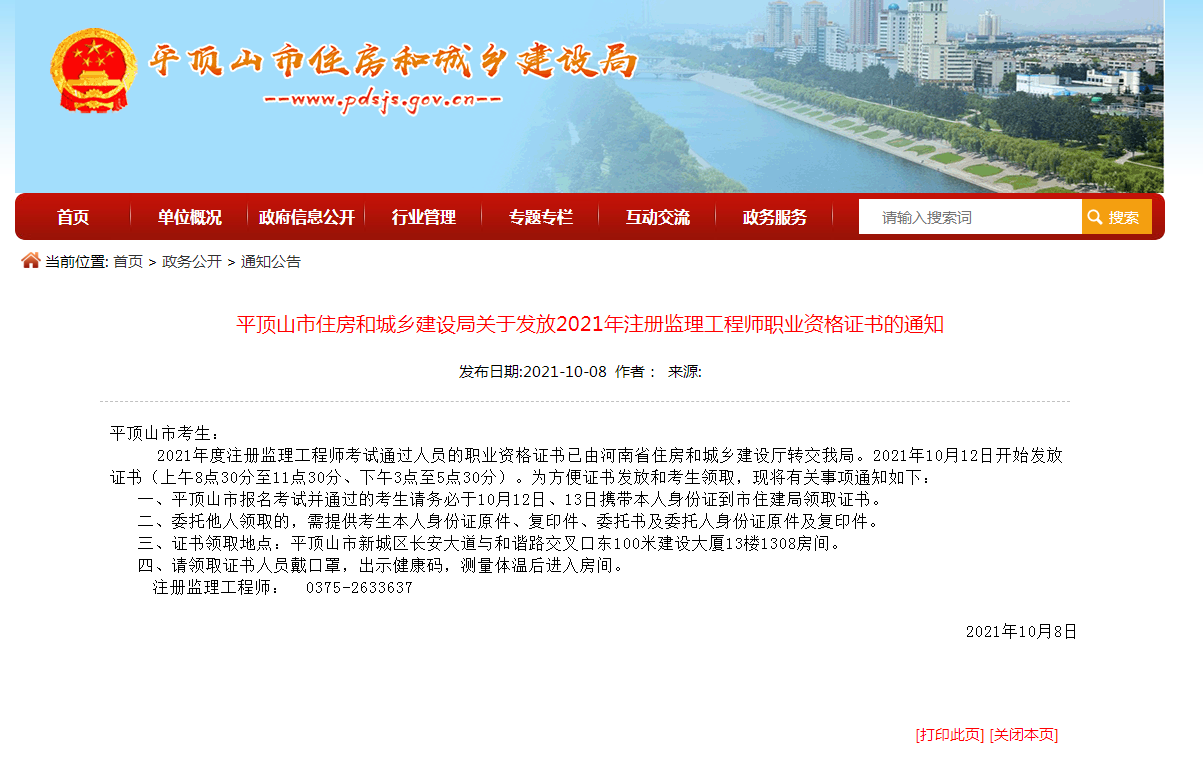 10月8日,平頂山市住房和城鄉建設局發布了2021年注冊監理工程師職業資格證書的通知,平頂山2021年度注冊監理工程師考試通過人員的職業資格證書已由河南省住房和城鄉建設廳轉交平頂山市住房和城鄉建設局,2021年10月12日開始發放證書(上午8點30分至11點30分、下午3點至5點30分)。為方便證書發放和考生領取,現將有關事項通知如下: