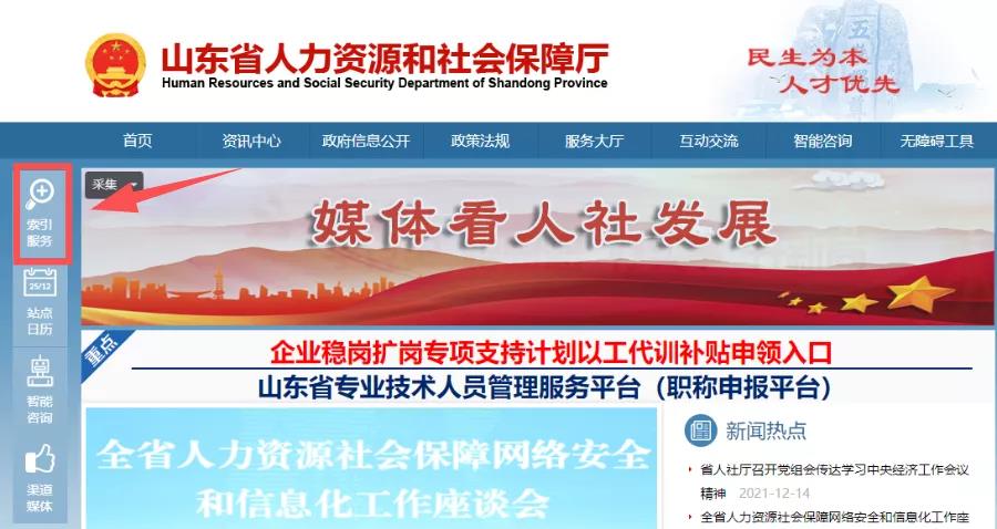 第一步,登錄自己所在省份的人社局官網,找到搜索服務。以山東省為例: