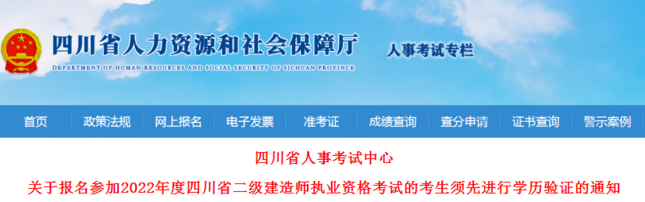 根據《專業技術人員資格考試報名證明事項告知承諾制》的要求,擬報名參加2022年度四川省二級建造師資格考試的考生須先進行學歷驗證。學歷信息在線核查結果為“未通過需人工核查”或“可繼續驗證或人工核查”的不會影響后續報名,但須在填報報名表時上傳相關證書原件電子照片,進行人工核查。