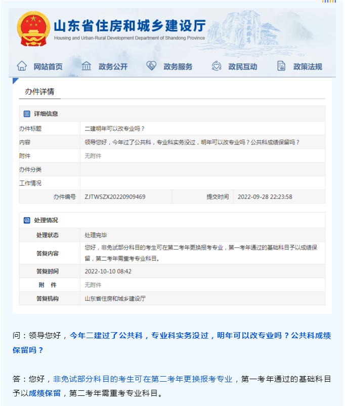 問:領導您好,今年二建過了公共科,專業科實務沒過,明年可以改專業嗎?公共科成績保留嗎?