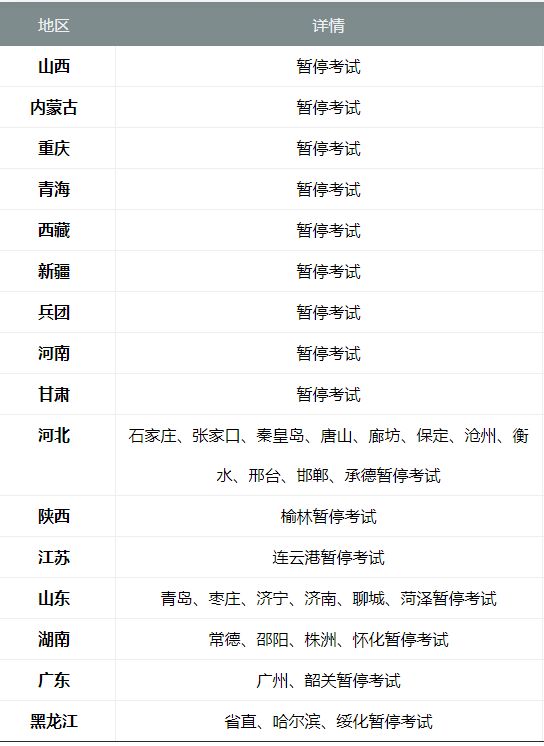 又有新增!河北(石家莊、張家口、秦皇島、唐山、廊坊、保定、滄州、衡水、邢臺、邯鄲、承德)、黑龍江(省直、哈爾濱)、陜西榆林、廣東韶關(guān)地區(qū)發(fā)布22年一建考試暫停舉行。