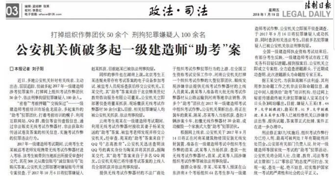 近日,多地公安機關針對有關線索,主動出擊,層層追蹤,偵破多起2017年一級建造師涉考犯罪案件,打掉網上組織考試作弊團伙50余個,依法刑事拘留犯罪嫌疑人100余人。