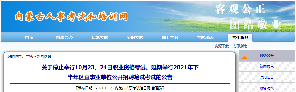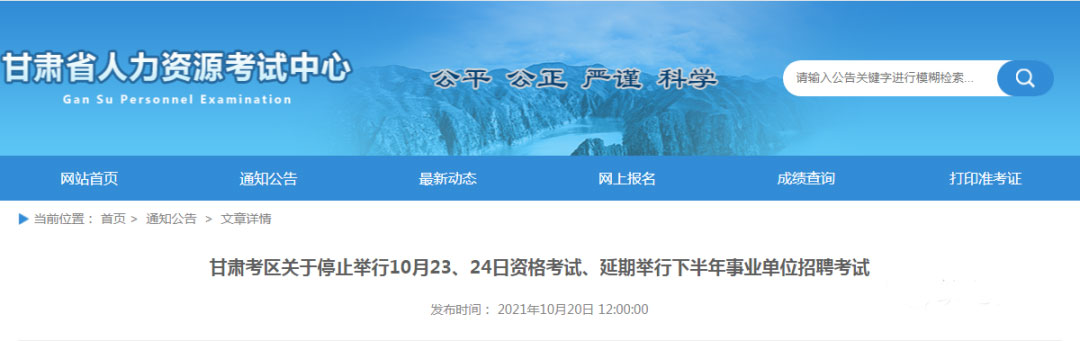原定于2021年10月23日舉行的甘肅省下半年事業單位公開招聘分類考試筆試延期舉行,考試具體時間、地點將在甘肅省人力資源和社會保障廳“人事考試”欄目、甘肅省人力資源考試中心網頁、微信公眾號另行通知。
