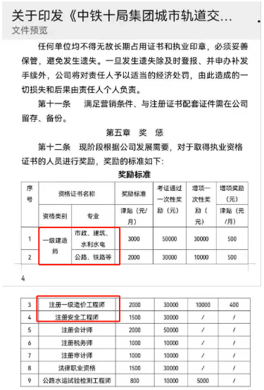 最近中鐵十局針對(duì)取得執(zhí)業(yè)資格證書的人員進(jìn)行獎(jiǎng)勵(lì),其中一級(jí)建造師、注冊(cè)一級(jí)造價(jià)工程師、注冊(cè)安全工程師均在獎(jiǎng)勵(lì)范圍內(nèi),獎(jiǎng)勵(lì)如下: