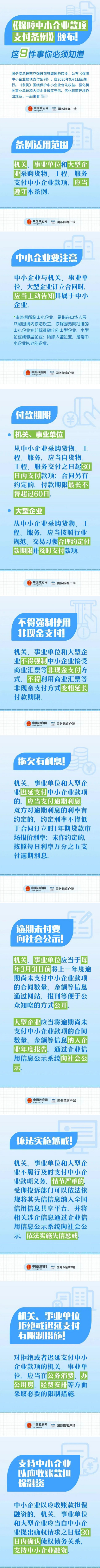 2020年7月5日國務(wù)院頒布第728號令《保障中小企業(yè)款項支付條例》,自2020年9月1日起施行。為保障中小企業(yè)被拖欠的款項及時支付,《條例》規(guī)定: