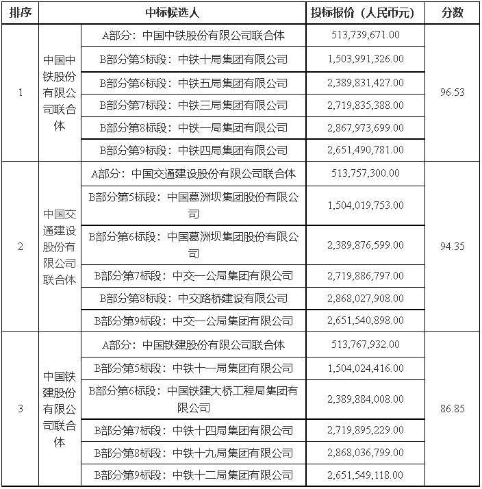 3. 中國中鐵股份有限公司聯合體:中國中鐵股份有限公司、中鐵投資集團有限公司、中鐵交通投資集團有限公司、中鐵東北投資發展有限公司、中鐵一局集團有限公司、中鐵二局集團有限公司、中鐵三局集團有限公司、中鐵四局集團有限公司、中鐵五局集團有限公司、中鐵七局集團有限公司、中鐵八局集團有限公司、中鐵九局集團有限公司、中鐵隧道局集團有限公司、中鐵北京工程局集團有限公司、中鐵上海工程局集團有限公司。
