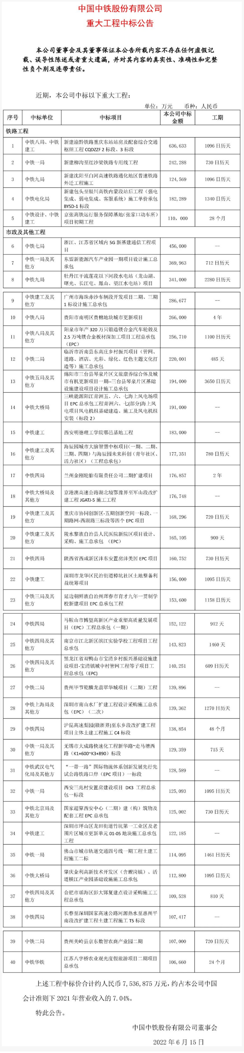 6月15日,中國中鐵股份有限公司發布中標公告,近日中標753億大工程。