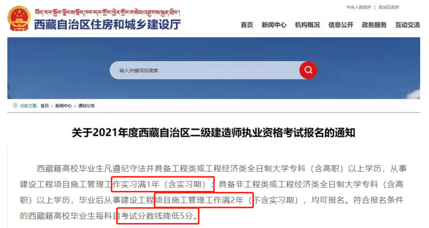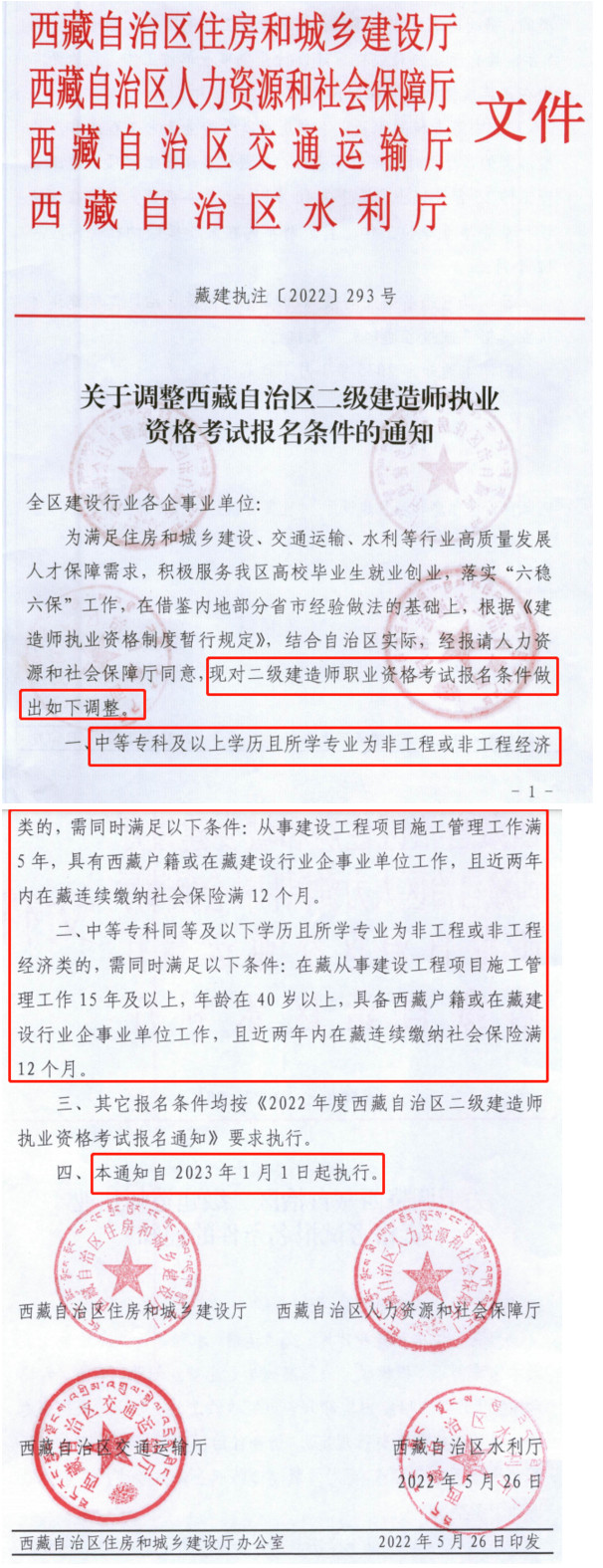 剛剛,西藏自治區住建廳發布《關于調整西藏自治區二級建造師執業資格考試報名條件的通知》,本通知自2023年1月1日起執行。明確: