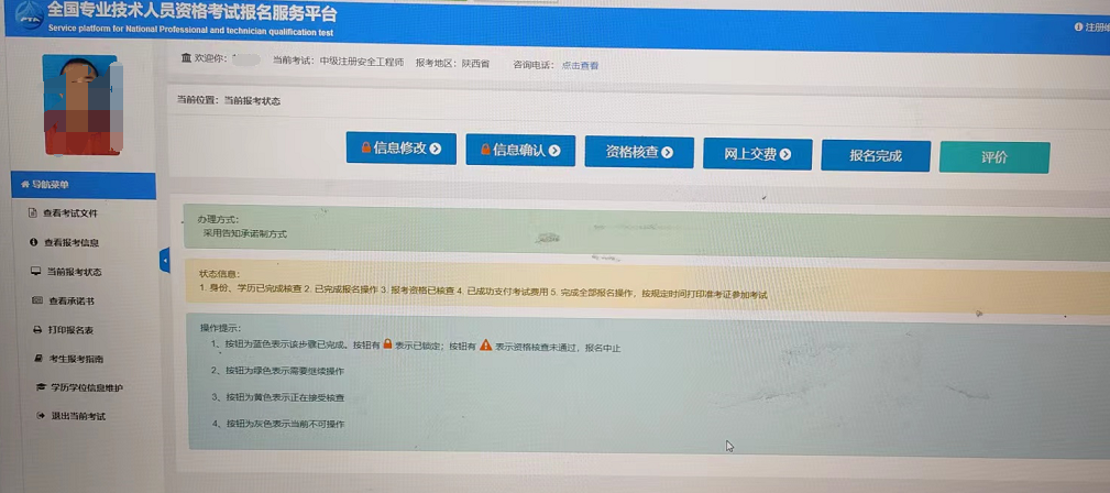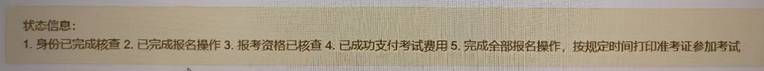 狀態(tài)信息需顯示:1.身份已完成核查;2.已完成報(bào)名操作;3.報(bào)考資格已核查;4.已成功支付考試費(fèi)用;5.完成全部報(bào)名操作,按規(guī)定時(shí)間打印準(zhǔn)考證參加考試。