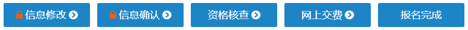 當(dāng)前報(bào)考狀態(tài)呈現(xiàn)如下圖,信息修改、信息確認(rèn)、資格核查、網(wǎng)上交費(fèi)、報(bào)名完成5個(gè)按鈕均呈現(xiàn)藍(lán)色背景狀態(tài),且信息修改和信息確認(rèn)已鎖定,有報(bào)名完成字樣等。