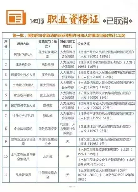 李克強總理在今年7月15日主持召開國務院常務會議。會議決定,在去年以來已取消149項職業資格的基礎上,再取消網絡廣告經紀人、注冊電子貿易師、全國外貿業務員、港口裝卸工等62項職業資格。還將繼續集中取消職業資格許可和認定事項。備考前要查清楚!