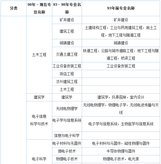 1、本表按教育部現行《普通高等學校本科專業目錄新舊專業對照表》編制,共涉及“土建類、測繪類、水利類、交通運輸類、能源動力類、地礦類、材料類、電氣信息類、機械類、管理科學與工程類、生物工程類、化工與制藥類、工程力學類”等18類45個專業,其中本專業100個,相近專業9個。