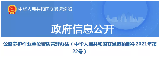《公路養(yǎng)護(hù)作業(yè)單位資質(zhì)管理辦法》已于2021年8月25日經(jīng)第22次部務(wù)會議通過,現(xiàn)予公布,自2022年1月1日起施行。