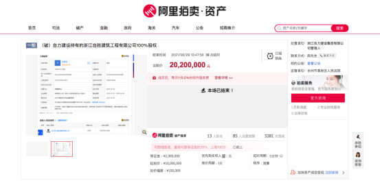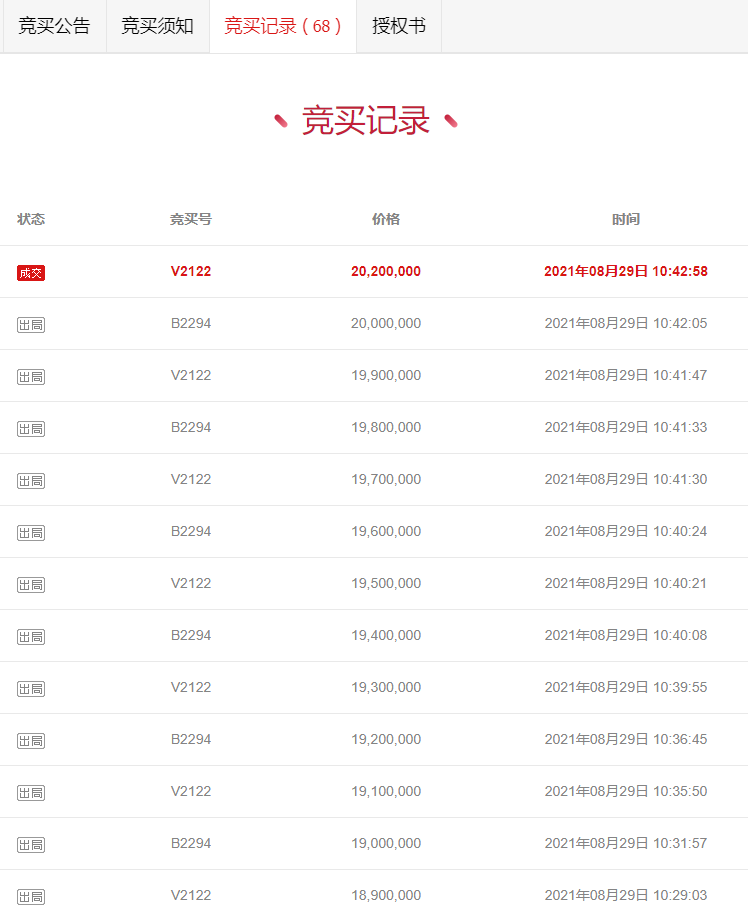 8月28日,在淘寶網司法拍賣網絡平臺上進行第一次公開拍賣,最終經過68輪的竟賣出價,最終以2020萬元的高價成交。