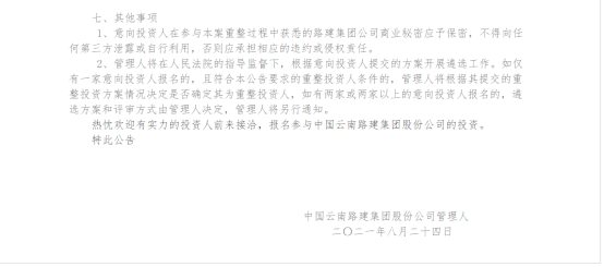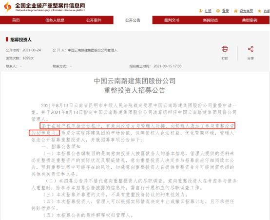前段時間,中國云南路建集團股份公司申請破產重整。