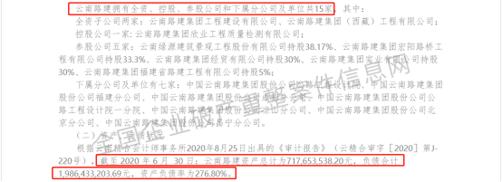 根據云南精合會計師事務所2020年8月25日出具的《審計報告》(云精合審字[2020]第J-220號),截至 2020 年 6 月 30 日:云南路建資產總計為717,653,538.20元,負債合計1,986,433,203.69元,資產負債率為276.80%。