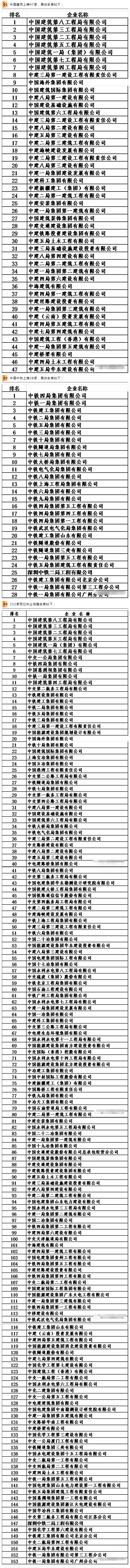 從榜單上可以看到,前十強中有六家來自中建工程局,中建八局位列榜首。中建和中鐵上榜最多,分別是47家和28家。