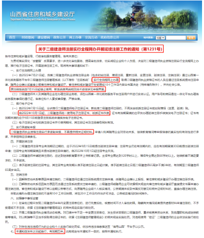 自2022年7月21日起,我省二級(jí)建造師執(zhí)業(yè)資格注冊(cè)業(yè)務(wù)(包含初始注冊(cè)、增項(xiàng)注冊(cè)、重新注冊(cè)、變更注冊(cè)、延續(xù)注冊(cè)、注銷(xiāo)注冊(cè))通過(guò)山西省一體化政務(wù)服務(wù)平臺(tái)中二級(jí)建造師注冊(cè)管理系統(tǒng)實(shí)行全流程網(wǎng)上辦理。
