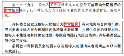 發現投標人的報價為異常低價,有可能影響合同履行的,應當要求投標人在合理期限內作澄清或者說明,并提供必要的證明材料。不能說明其報價合理性,導致合同履行風險過高的,應當否決其投標。