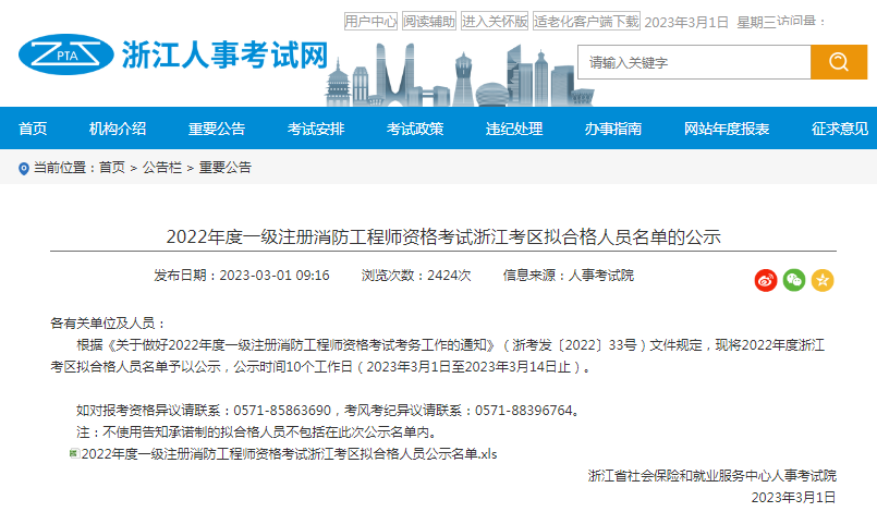3月1日,浙江人事考試網發布了《關于做好2022年度一級注冊消防工程師資格考試考務工作的通知》(浙考發〔2022〕33號)文件規定,現將2022年度浙江考區擬合格人員名單予以公示,公示時間10個工作日(2023年3月1日至2023年3月14日止)。